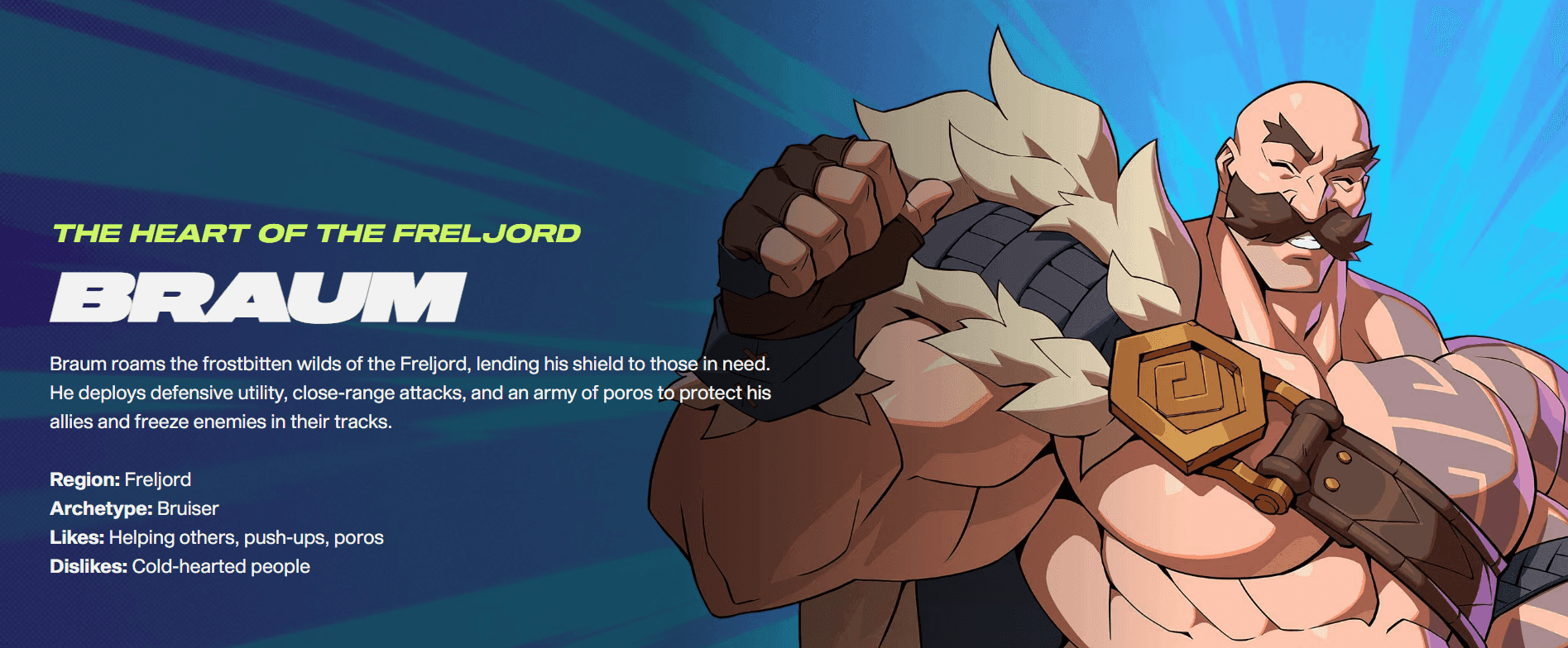Braum proves defense can be just as hype as offense. He’s easy enough for beginners to pick up, but once you start managing Unbreakable and landing those freeze setups, the depth really shows. If you like guarding your squad while bonking people with what’s basically a giant vault door (i mean, a shield), then Braum’s your guy. The only question is... are you standing behind him, or in front of him?