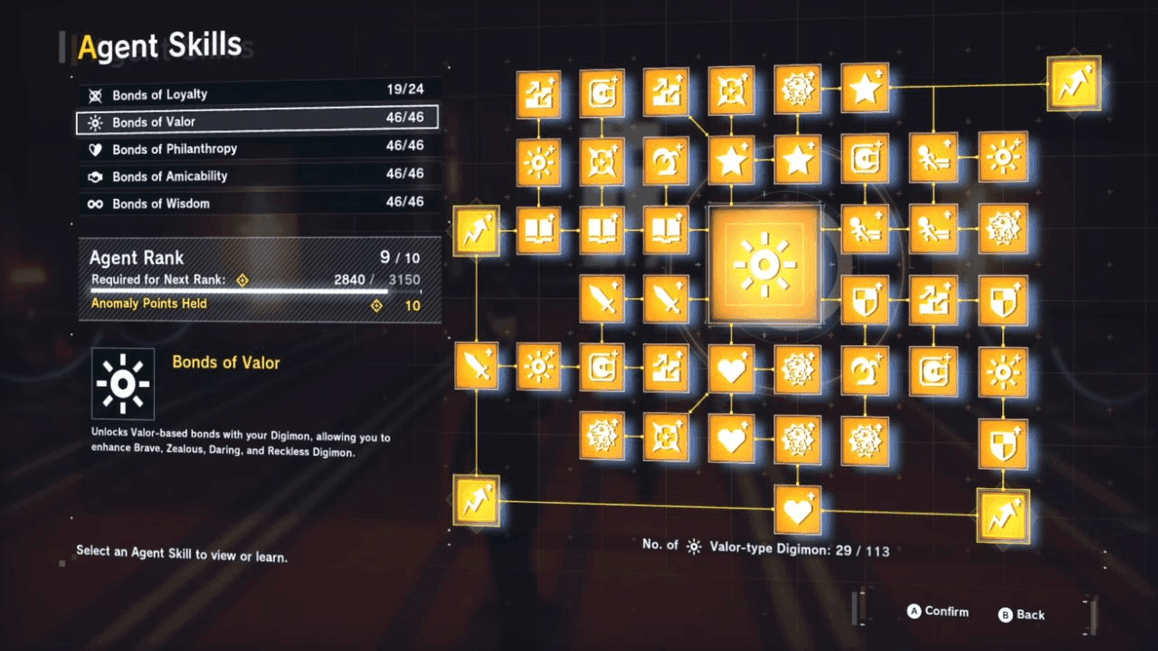 لا يمكنك إعادة تعيين مهارات العميل، لذا خطط لاستثماراتك بعناية بناءً على فريق Digimon المفضل لديك.