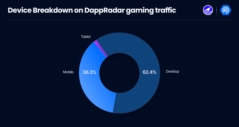 عند التعمق في توزيع البيانات الجغرافية بناءً على تحليل تصنيفات الألعاب من DappRadar، يتضح أن 32% من الجمهور يأتي من آسيا. وفيما يتعلق باستخدام الأجهزة، يوجد تقسيم بنسبة 62% على أجهزة الكمبيوتر المكتبية و 38% على منصات الهاتف المحمول.