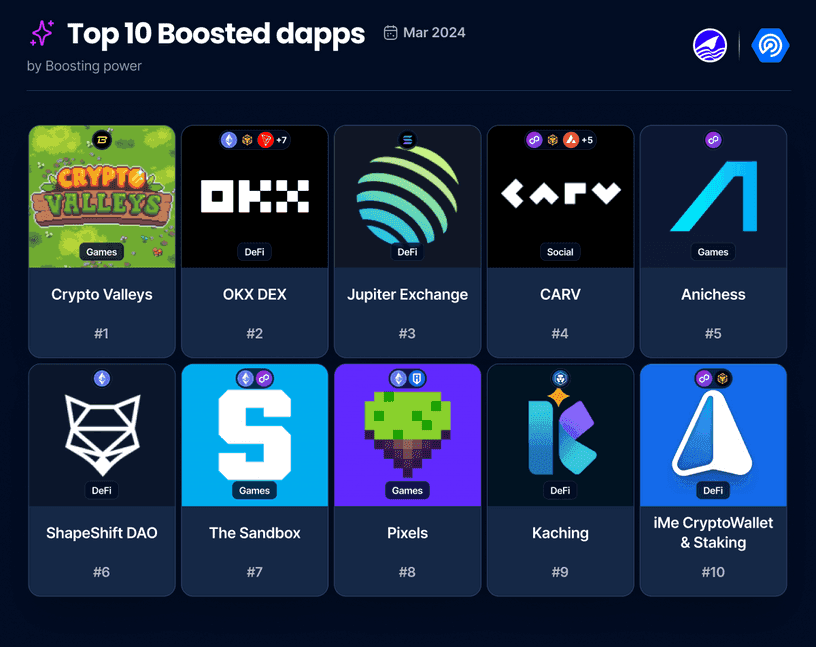 من بين التطبيقات اللامركزية المميزة، خمسة مصنفة ضمن الألعاب، وكل منها مدعوم من استوديوهات ألعاب أو فرق قادمة من دول آسيوية. وقد أظهرت هذه المشاريع الألعابية قدرة رائعة على إشراك مجتمعات واسعة من خلال نظام التعزيز، مما يؤكد الدور الحاسم لدعم المجتمع في Web3.