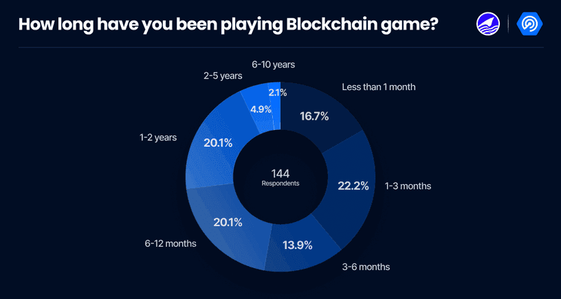 أشار 72.9% من المستجيبين إلى أنهم بدأوا رحلتهم في ألعاب البلوكتشين خلال العام الماضي، مما يشير إلى تدفق كبير من المشاركين الجدد إلى السوق على الرغم من التحديات التي فرضتها فترة الشتاء المشفرة الطويلة.