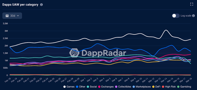 • 35% من حركة المرور إلى تصنيفات ألعاب DappRadar تأتي من آسيا، مما يسلط الضوء على الاهتمام الكبير للمنطقة بهذا القطاع.