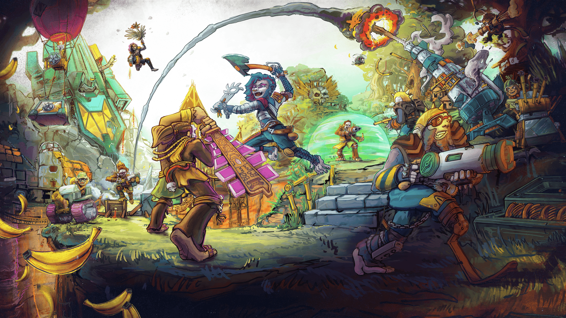 Everything changed when a spaceship from the Bureau of Astral Supply (B.A.S.) crashed into the jungle, spreading Bastonium contamination. Fearful of its effects, the Elders banned all contact with the crash site. However, a misfit chimp, cast out by the Elites, uncovered the lost history of the Arcas Champions and the true power of Bastonium. After a strange accident fused his brain with the element, he became MadMonkey, leading the Renegades in rebellion against the Village Elites, reigniting the war.