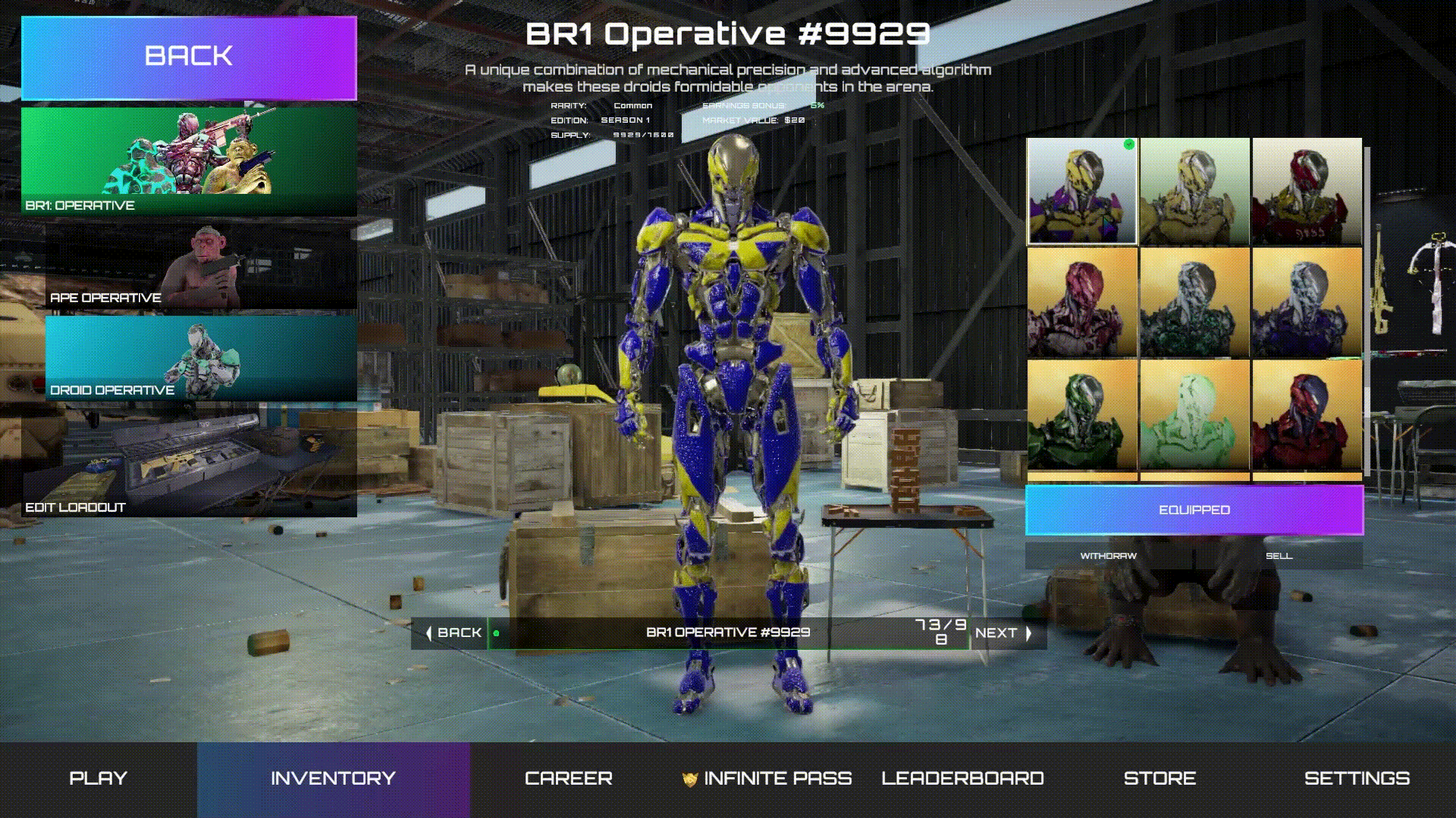 Every player kicks things off with a base Operative and some starter weapons. Operatives come in three types: Apes, Droids, and Humans. Each one has its own backstory and offers different Earnings Retention Bonuses, or ERBs for short. Apes usually give the biggest bonus, Droids come next, and Humans offer the lowest. You can get more Operatives through loot boxes, missions, or by leveling up your Infinite Pass.