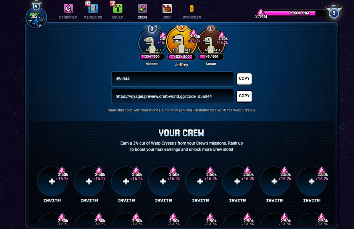 Craft World has a simple referral system that lets you earn more by inviting friends. When someone joins through your referral link, they’ll be added to your crew. You’ll then earn 3% of the Warp Crystals they get from completing missions.