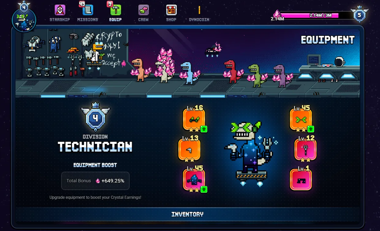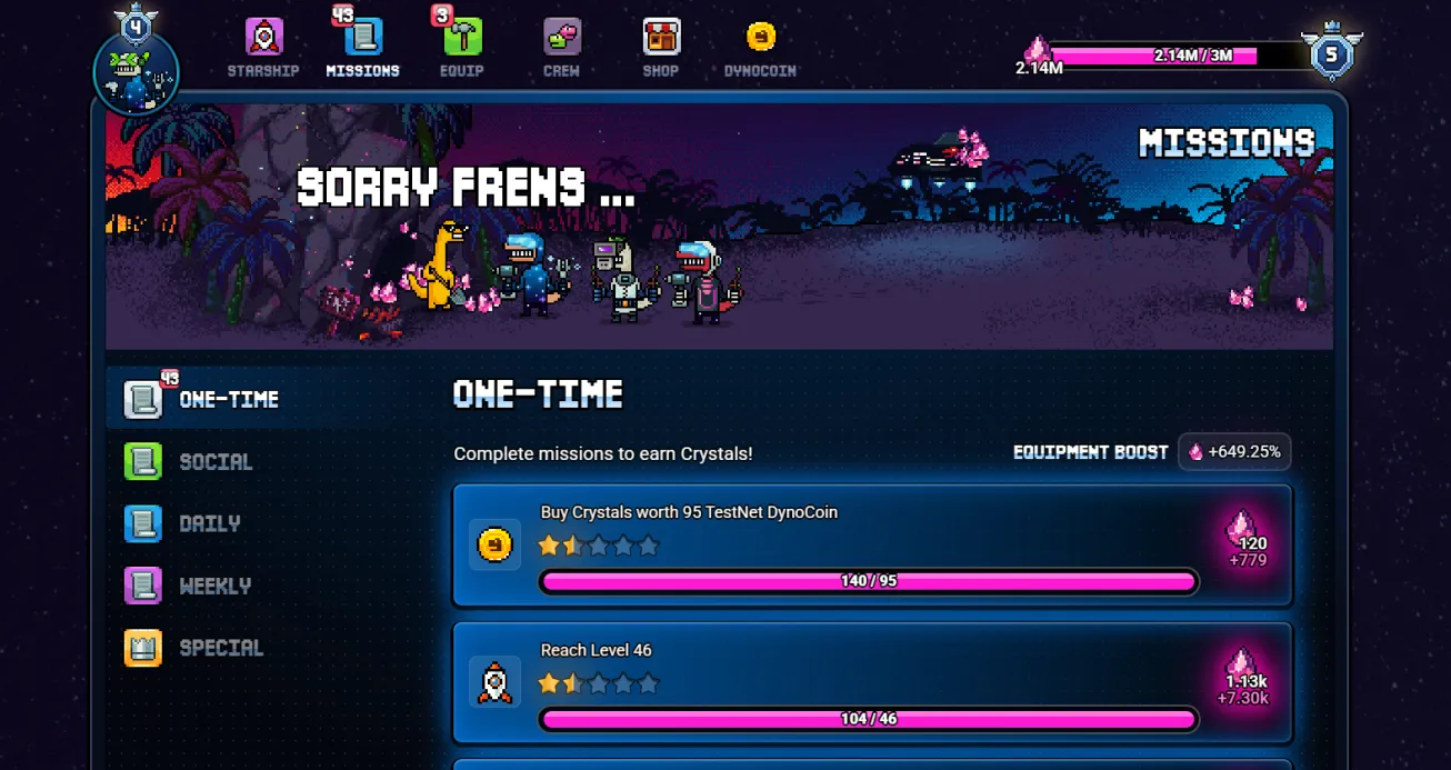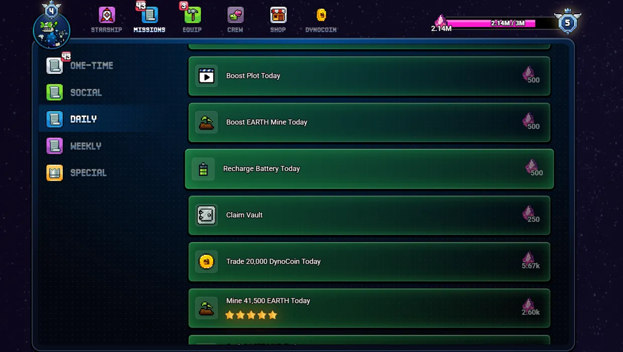 - Daily – Simple in-game tasks like mining and crafting basic resources, spending testnet DynoCoin (note: during the play-to-airdrop event, any DynoCoin spent is testnet only), and a few easy social media tasks.