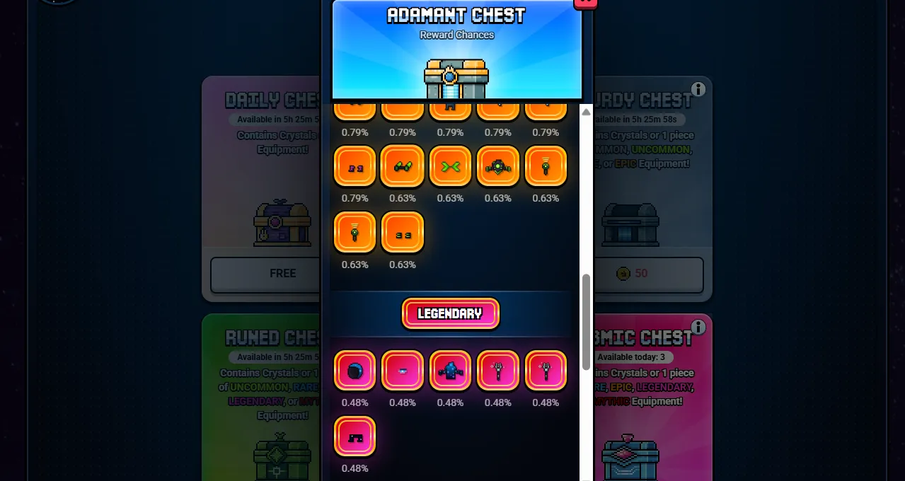 So how do you get those gear items? The Shop is where luck comes in. The Shop lets you buy different kinds of chests, each of which gives you one random equipment item. Chests come in different tiers, which affect the probability of obtaining higher-rarity gear. (Gear rarity from lowest to highest: Common, Uncommon, Rare, Epic, Legendary, Mythic.)