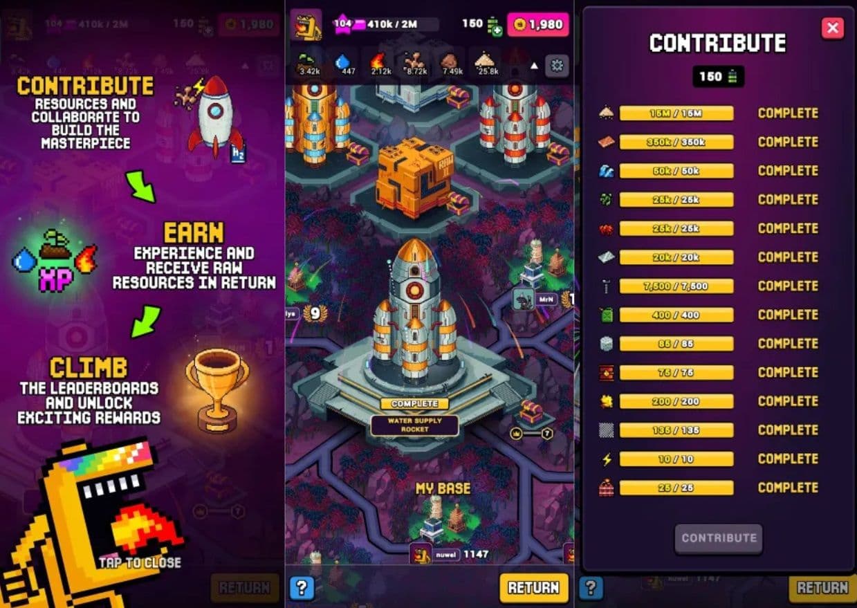During certain periods, Craft World will hold Masterpiece Events, which are community-driven missions where specific resources are needed to help prepare the rocket for launch. A list of required resources will be shown during the event. All players can contribute to this shared goal, and a leaderboard ranks contributors based on how much they’ve given. Top contributors usually get bonus rewards like rare resources and extra DynoCoin.