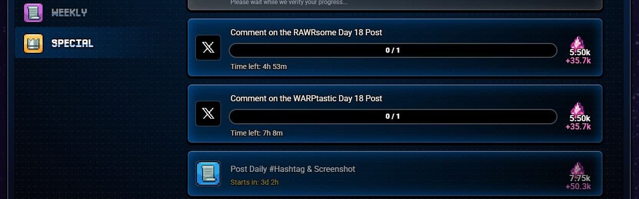 Complete Missions for Warp Crystals: After linking, you progress through the game and get rewarded with Warp Crystals (the game's version of airdrop points) by completing various game-related and social media quests.