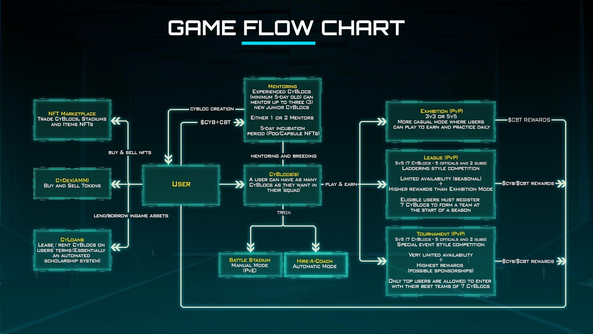 The CyBall game engine combines different elements of strategy, simulation and chance into the form of an exciting and competitive turn-based football card game, where players compete to see who can score the most goals. Players train up their CyBlocs to compete in various game modes with varying levels of rewards. Existing CyBlocs can also mentor young CyBlocs, creating the next generation of unique NFTs. In future expansions, we aim to give players more ways to spend accrued rewards, both in CyBall and in the wider CyBloc universe.