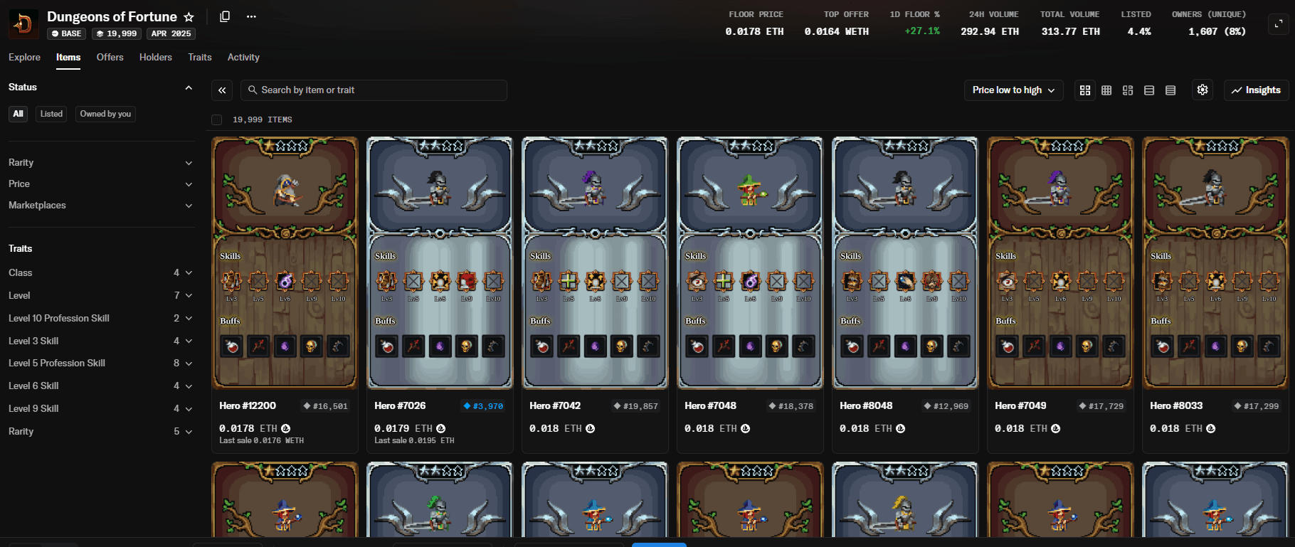 Dungeons of Fortune operates on Base, an Ethereum Layer-2 blockchain. Heroes are minted as NFTs using USDC through the in-game Gacha system found in the Tavern. Each hero comes with randomized traits including class and skill paths. Once a hero dies during a dungeon run, the NFT is permanently burned, removing it from circulation and freeing up space for new heroes to be minted. While alive, hero NFTs can be traded on secondary marketplaces like OpenSea, allowing players to buy and sell heroes directly without needing to mint from the Tavern.