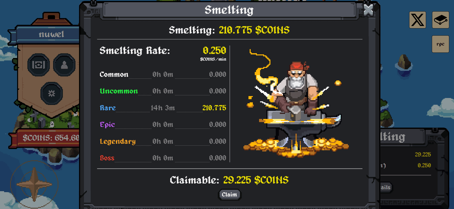 - Smelt your rewards and wait. Loot doesn’t turn into $COINS instantly. It must go through smelting—a time-based process where rewards unlock gradually. The rarer the loot, the longer the smelting takes. Surviving heroes also enter cooldown, and can’t re-enter a dungeon until the timer expires.