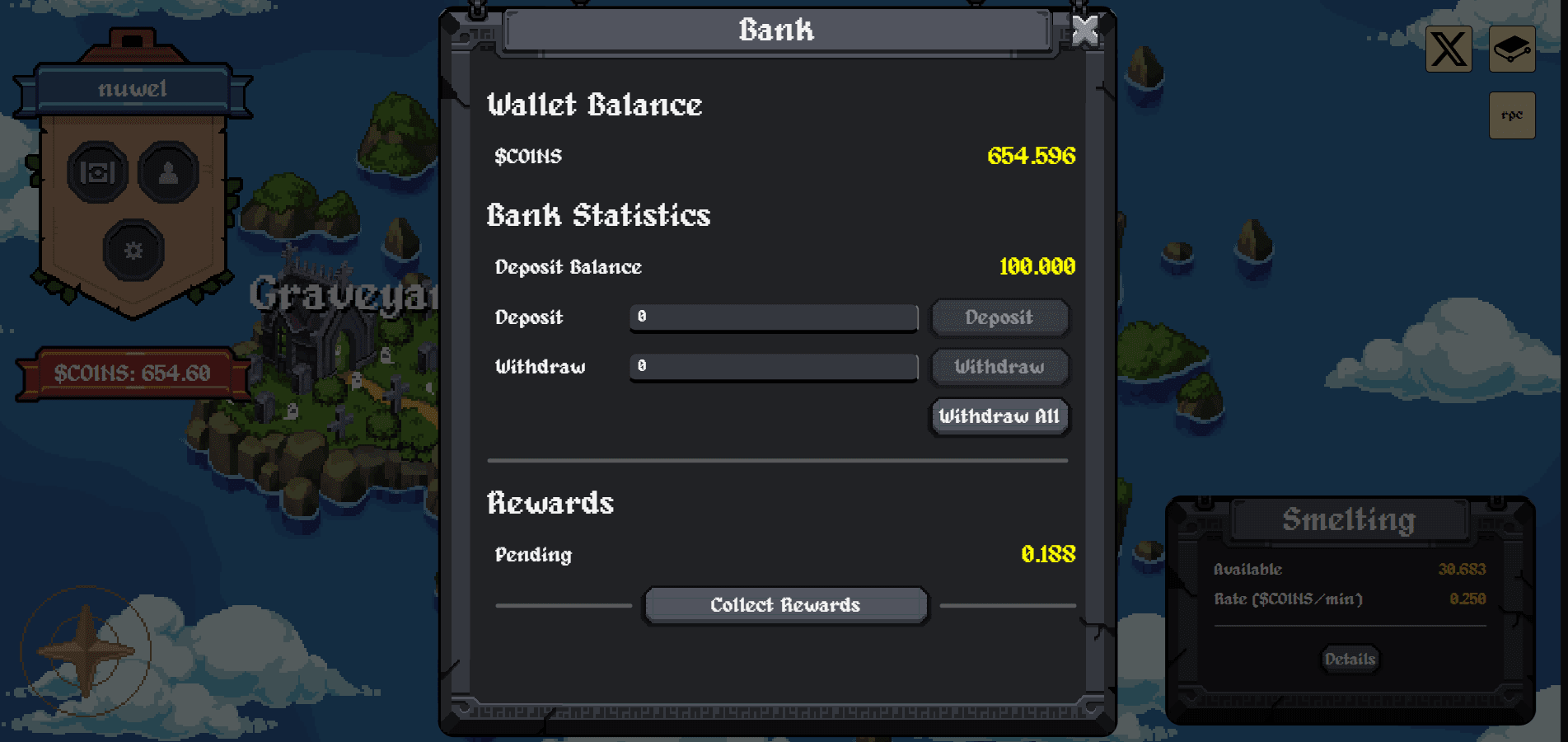 Alongside the Graveyard is the Bank, a second passive rewards system. Instead of sacrificing heroes, players can deposit unused $COINS into the Bank and earn a share of global dungeon spending. The system works similarly: rewards are distributed proportionally based on your share of total Bank deposits. While the Bank generally offers lower returns than the Graveyard, it’s also lower risk—you don’t need to burn NFTs to participate. It’s ideal for players who want to earn passively without committing to the full mint-play-die loop.