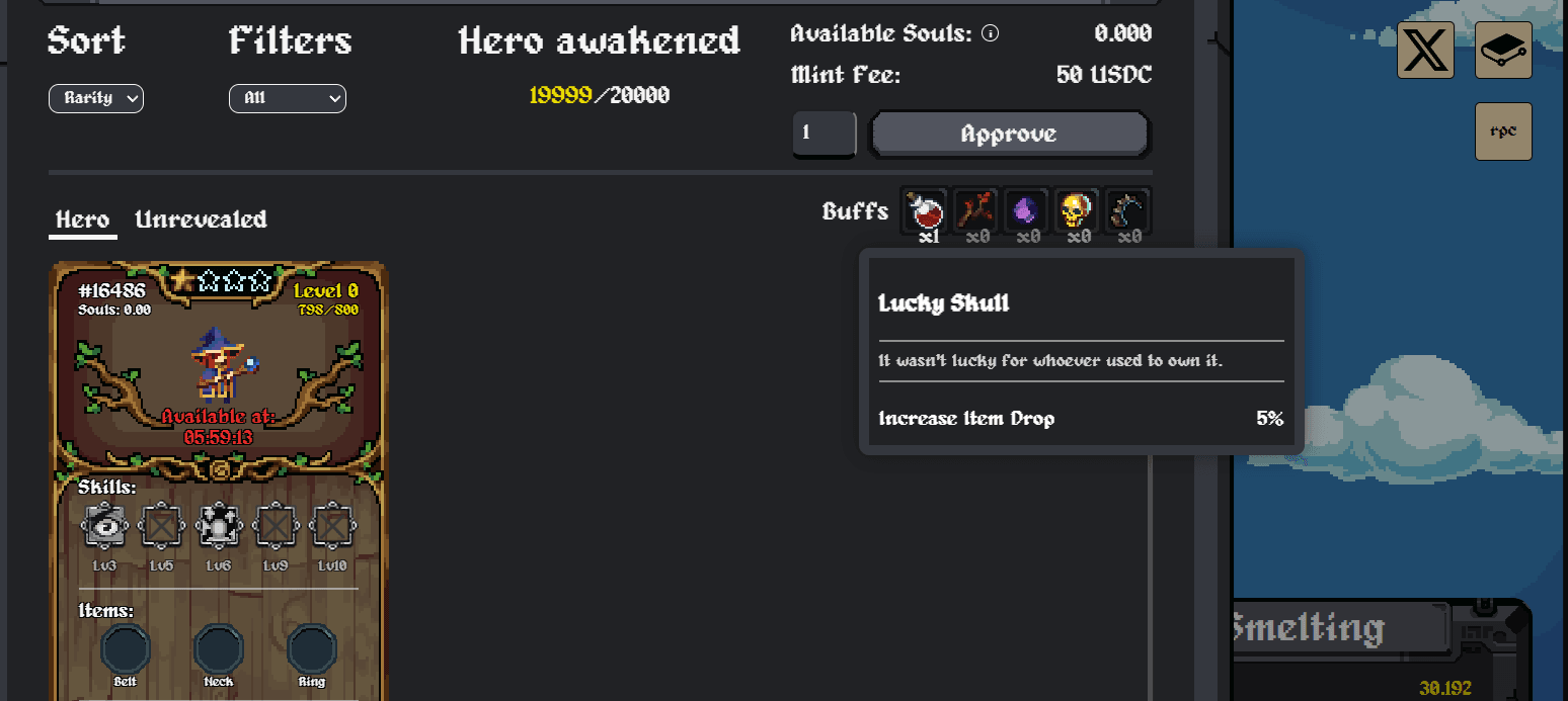 Heroes are minted through an in-game gacha system using USDC. Each hero comes with a randomly assigned class, skill path, and unique characteristics. As they survive dungeon runs, they gain EXP and level up. Higher levels unlock new skills and increase their potential rewards in future runs. Stronger heroes are better equipped to handle higher-tier dungeons, which offer better loot but carry more risk. Hero supply is capped at 20,000 at any given time. However, this cap replenishes—whenever a hero dies in a dungeon, it is burned, and a new mint slot becomes available.