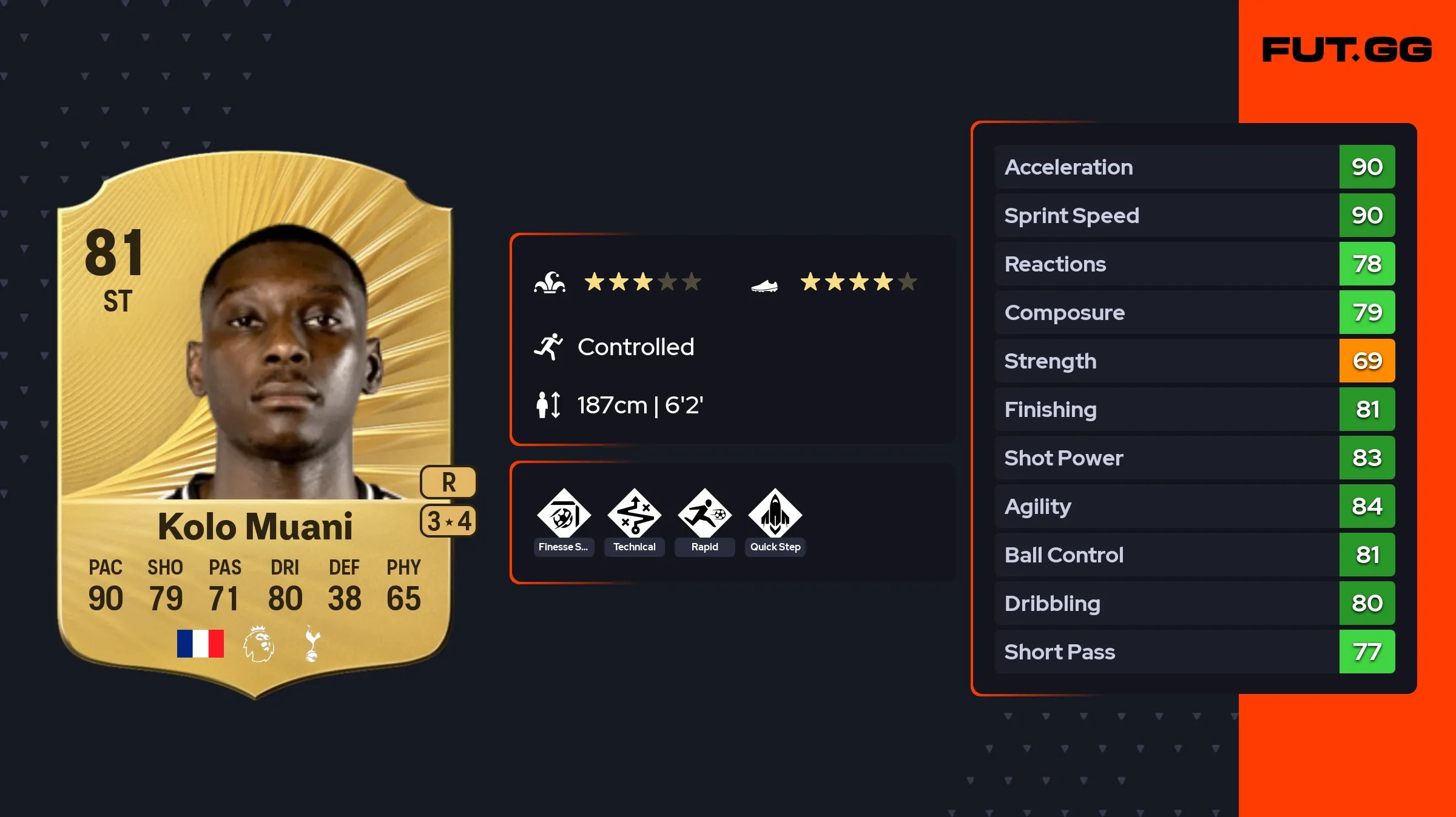 Randal Kolo Muani leads the budget striker category with 90 pace and 80 dribbling. His combination of speed and ball control terrorizes defenses.