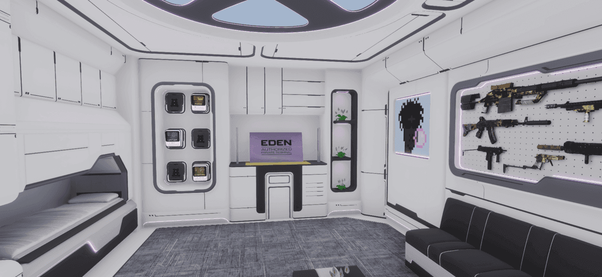 Los NFTs en Eden no son solo equipo de combate. También hay bienes raíces comerciables en Eden City, además de mejoras de plugins para tu exoesqueleto que te permitirán ajustar tu construcción y estilo de juego. Estos plugins también serán NFTs, dándote más control sobre cómo quieres jugar y progresar. Todo es parte del impulso del videojuego hacia lo que los desarrolladores llaman "Experiential DeFi", donde el comercio, el riesgo y el valor de los activos ocurren dentro del videojuego real, no en un dashboard o marketplace externo.