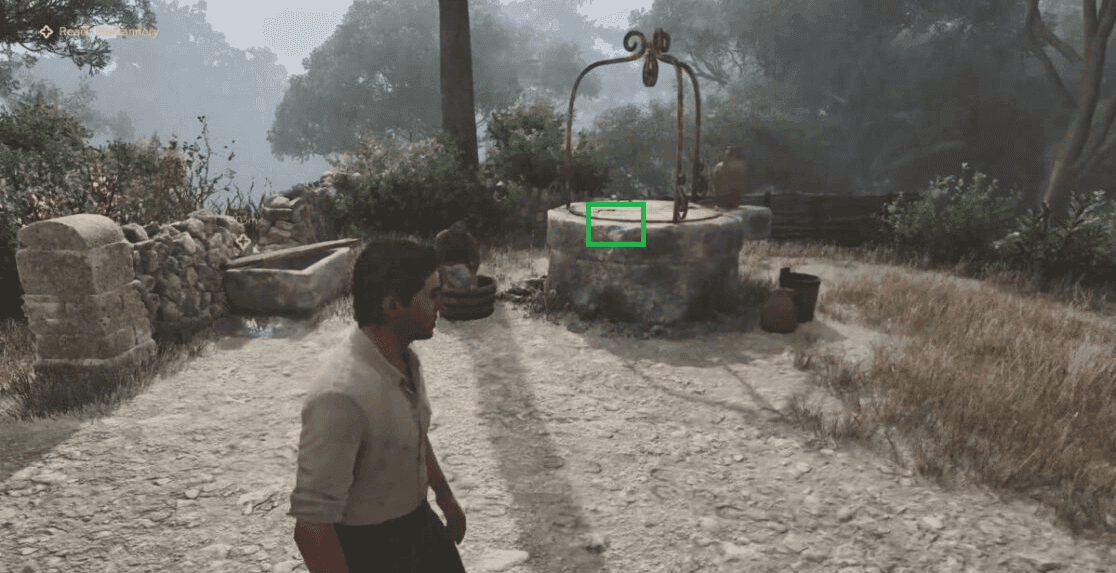 Tu primera oportunidad de coleccionable llega temprano en el capítulo. Mientras sigues el objetivo principal hacia la Curtiembre, haz un desvío crucial al oeste de la Ciudad San Celeste. Verás un pozo distintivo con una cubierta de piedra; el periódico descansa directamente encima, imposible de pasar por alto una vez que sabes dónde buscar.