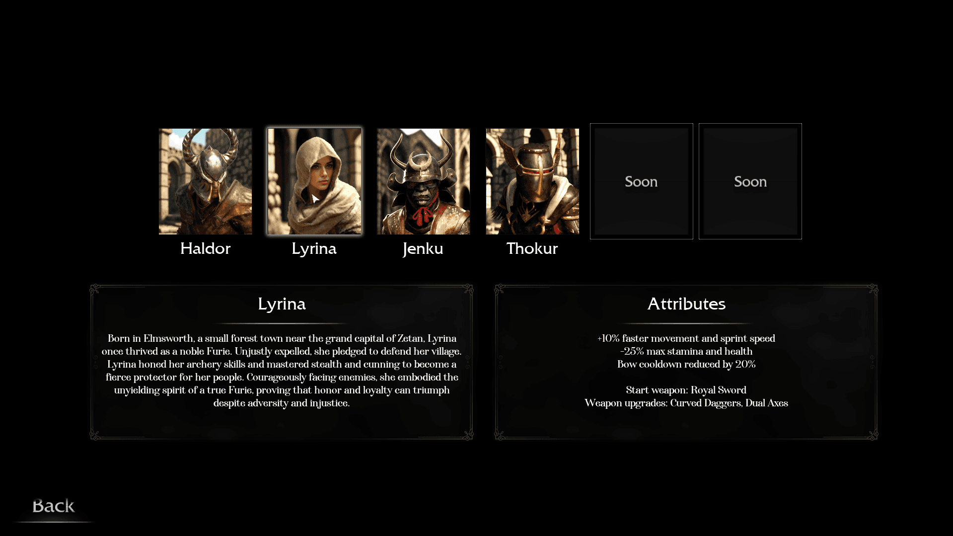 En la demo, estás limitado a un personaje, pero los desarrolladores han agregado recientemente algunos más con historias de fondo ricas, cada uno con sus propios atributos y armas iniciales. Personalmente, me atrae Lyrina, es como una asesina, empuñando dos dagas que permiten golpes rápidos y requieren menos resistencia para cada movimiento. Su habilidad inicial, un ataque con arco, puede aniquilar enemigos con un solo disparo, lo que la hace especialmente letal.