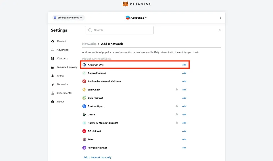 - Sous Réseaux personnalisés populaires, recherchez Arbitrum One et cliquez sur Ajouter.