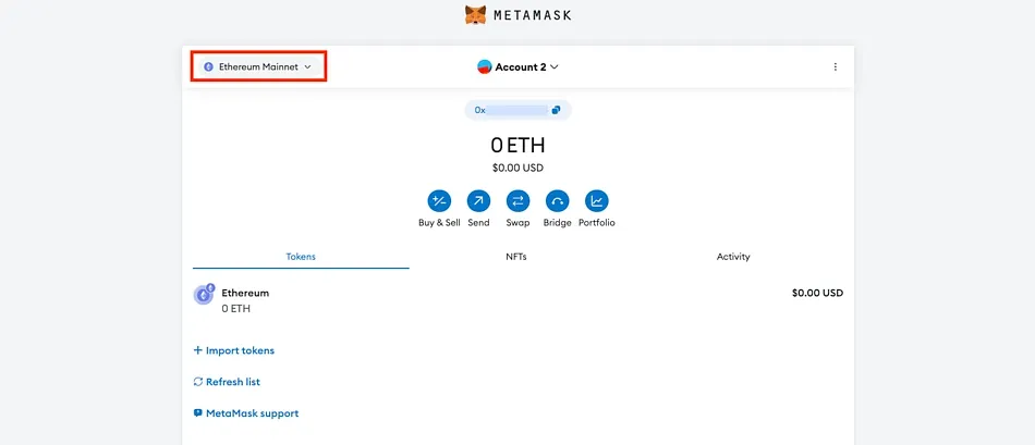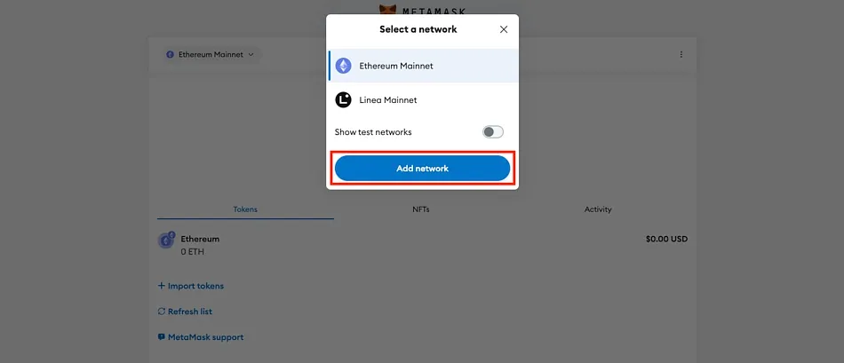 - Connectez-vous à votre compte MetaMask et cliquez sur le menu déroulant du réseau.