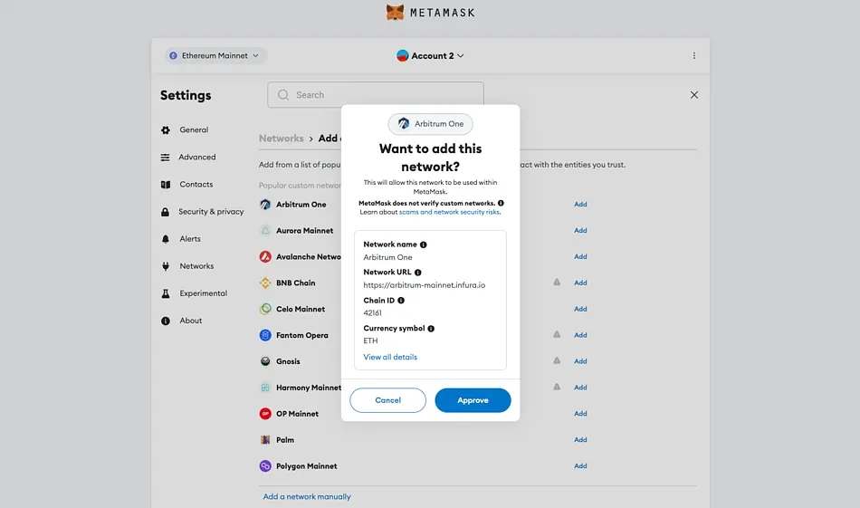 - Approuvez la demande d'ajout d'Arbitrum One à MetaMask.