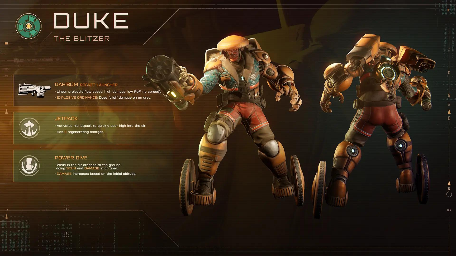 Duke est un combattant d'artillerie lourde avec des mitrailleuses attachées à ses bras. Les Drifters sont une culture nomade, déplaçant leurs vaisseaux de guerre d'un endroit à l'autre en fonction de leurs besoins, alors vous pouvez être sûr qu'il sait se battre.