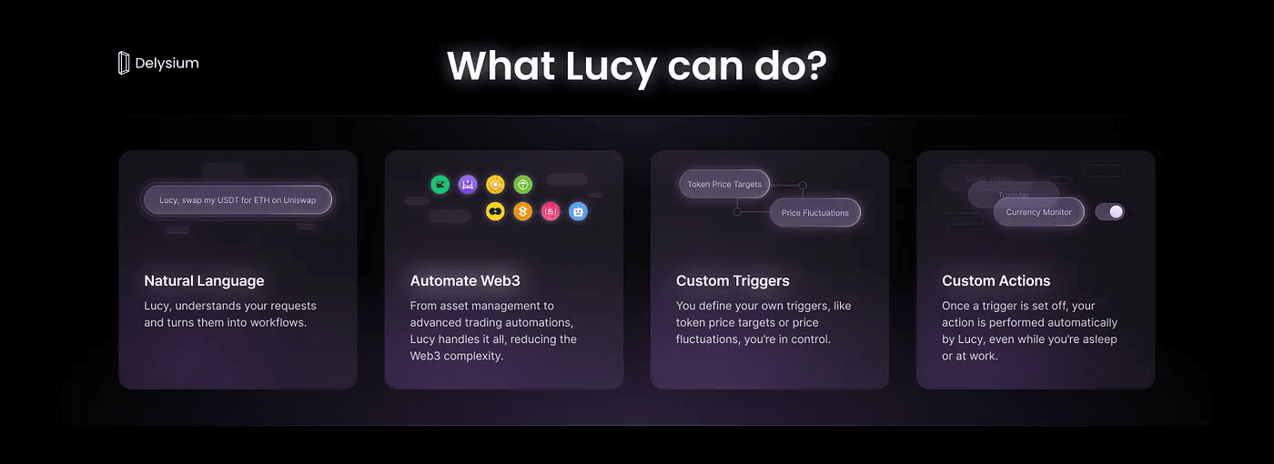 Delysium ने हाल ही में Lucy को पेश किया है, जो "YKILY" AI Agent Network के लिए एक ऑपरेटिंग सिस्टम है, जिसे Web3 इंटरैक्शन को बढ़ाने के लिए डिज़ाइन किया गया है। Google Cloud और Microsoft के समर्थन से विकसित, Lucy को ब्लॉकचेन इंफ्रास्ट्रक्चर के साथ सहज एकीकरण के लिए तैयार किया गया है, जिसका लक्ष्य अपने यूनिफाइड AI एजेंट आर्किटेक्चर के माध्यम से उपयोगकर्ताओं के लिए Web3 को सरल बनाना है। Lucy की क्षमताओं में क्रिप्टो-वर्कफ़्लो बनाना और नेचुरल लैंग्वेज कमांड और पर्सनलाइज्ड ट्रिगर के माध्यम से Ethereum और Binance Smart Chain dApps के साथ इंटरैक्शन की सुविधा शामिल है। व्यापक "YKILY" नेटवर्क के हिस्से के रूप में, Lucy विभिन्न विशेष AI एजेंट्स के लिए एक केंद्रीय हब के रूप में कार्य करता है, जो ट्रेडिंग सहायता से लेकर सूचना एकत्रीकरण तक की सेवाएं प्रदान करता है।