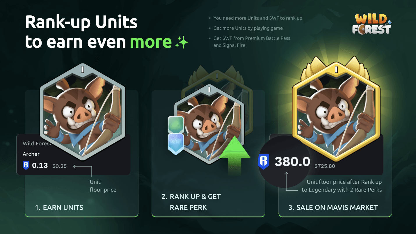 रैंक अप करने में रिसोर्स और $WF टोकन लगते हैं, लेकिन जब आप उन सूप-अप यूनिट्स को सेल के लिए लिस्ट करते हैं तो इन्वेस्टमेंट पर रिटर्न इसके लायक होता है। यह सब टाइमिंग और सही खरीदार खोजने के बारे में है जो टॉप डॉलर का भुगतान करने को तैयार है।