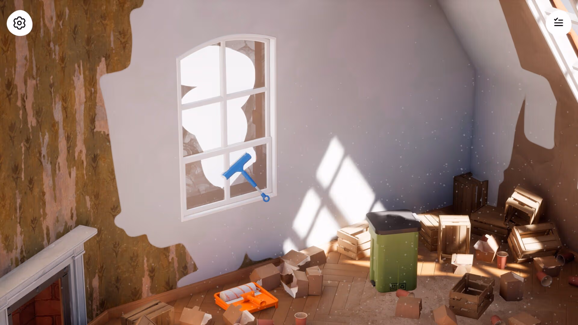 Hozy's gameplay loop is built on three repeating phases: clean, paint, decorate. Each abandoned room arrives in a state of neglect, and the process of bringing it back to life follows a natural progression. Dirt and debris come first, then the structural work of repainting walls and surfaces, and finally the personal touch of selecting and placing furniture and items.