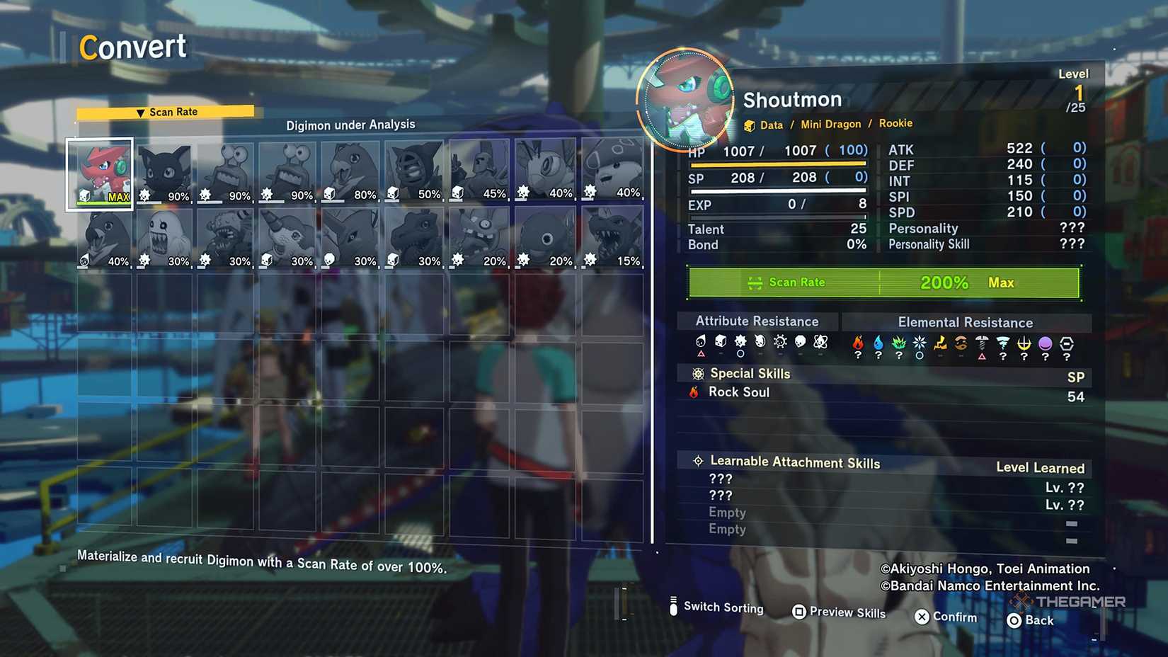 Jebakan terbesar yang dialami tamer baru adalah langsung mengonversi Digimon pada tingkat scan 100%. Hindari godaan itu! Pemindaian ekstra hingga 200% menciptakan partner yang jauh lebih kuat yang akan melayani Anda hingga konten akhir game.