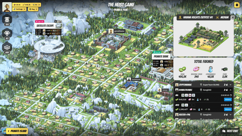 - Heists: Aktivitas gameplay utama di Primate Island, yaitu perampokan, yang membutuhkan perencanaan matang dan penilaian risiko. Pemain melakukan staking NFT, memilih waktu dengan bijak, dan berharap mendapatkan hasil yang menguntungkan berdasarkan dinamika Event Table.