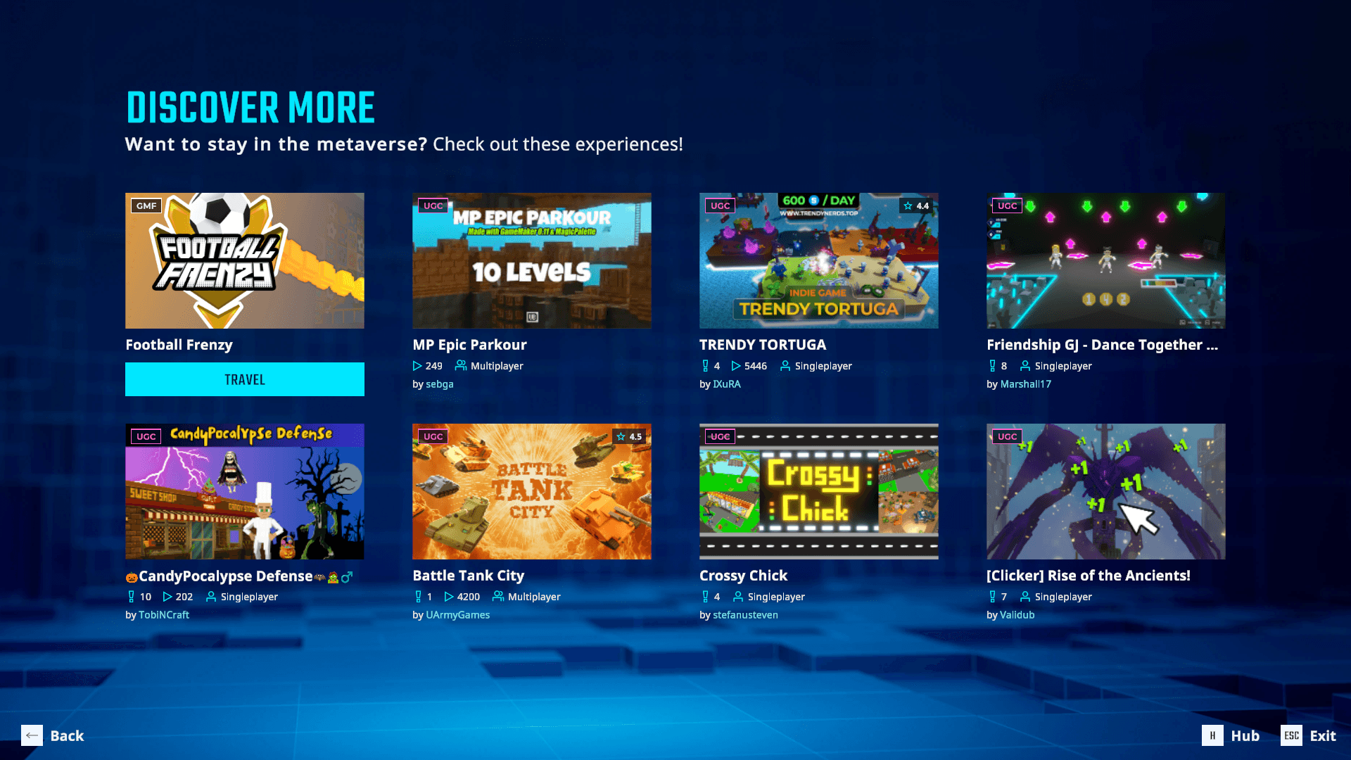 Selain itu, pemain dapat terjun ke Experiences, mini-game buatan UGC yang mencakup berbagai genre. Karena tidak ada alur cerita utama, gameplay berpusat pada sosialisasi dan eksplorasi. Dari quest petualangan dan tantangan teka-teki hingga rekreasi game populer seperti Among Us, Crossy Road, Battle Tanks, dan Dance Dance Revolution, selalu ada sesuatu yang baru untuk dicoba.