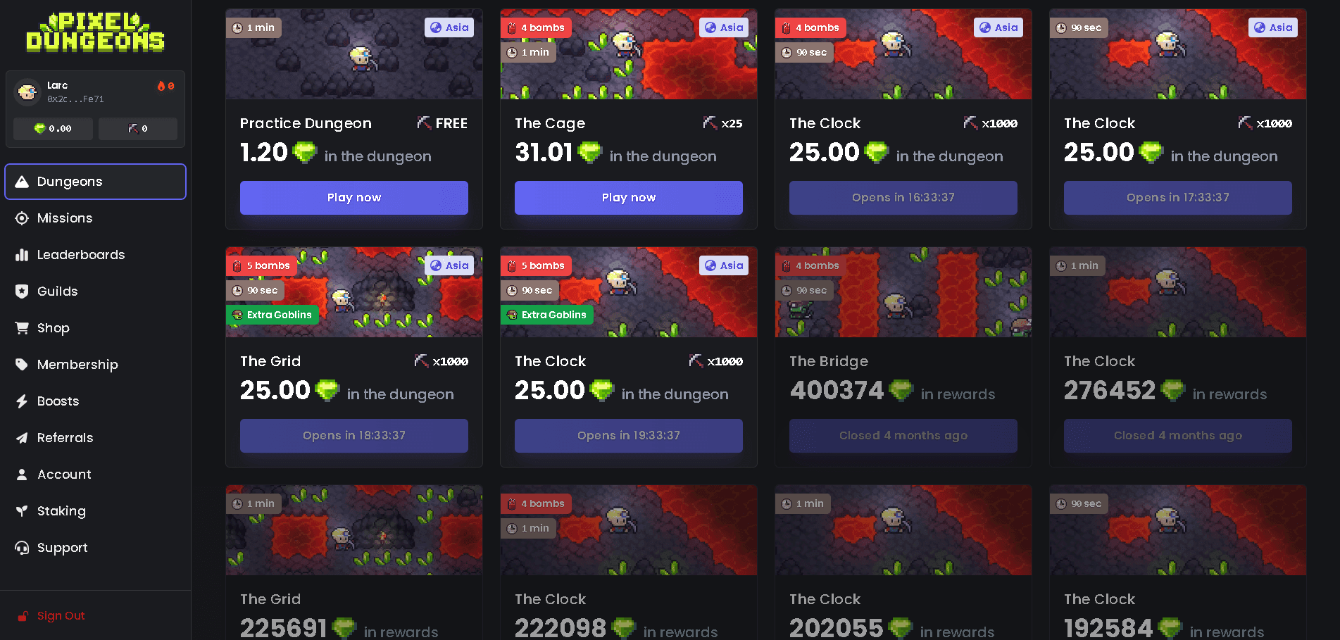Pixel Dungeons è un dungeon run game di 2 minuti in cui i giocatori estraggono token, schivano i nemici e cercano di fuggire con il loro bottino intatto. È costruito sulla blockchain Ronin e si connette direttamente all'ecosistema Pixels. L'idea è semplice: addentrarsi in un dungeon, rompere blocchi di minerale per raccogliere token $PIXEL e uscirne vivi. Se non ci riesci, perdi tutto, e qualcun altro può portarsi via il tuo bottino duramente guadagnato.