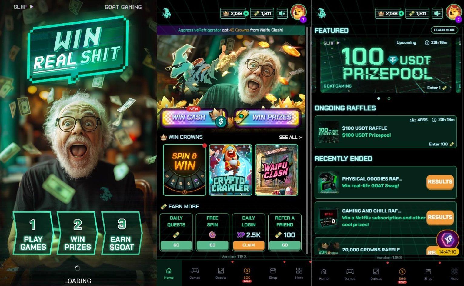 GOAT Gamingのゲームプレイは、特にモバイルやTelegramで手軽にアクセスできるカジュアルなミニゲームが中心です。これらのゲームは、高い複雑さや奥深いメカニクスを目指しているわけではありません。その代わりに、いつでも気軽にプレイできる短いセッションに焦点を当てています。現在、利用可能なタイトルには、Spin to Win、Crypto Crawler、GOAT Survivor、Waifu Clashなどのゲームがあり、Mighty Action Heroesとの連携もあります。これらはそれぞれ、タップベースの放置ゲームから基本的なアクションやサバイバルチャレンジまで、異なる種類の体験を提供します。ミニゲームの他に、GOAT Gamingは報酬ベースのクエストやラッフルも多数提供しています。