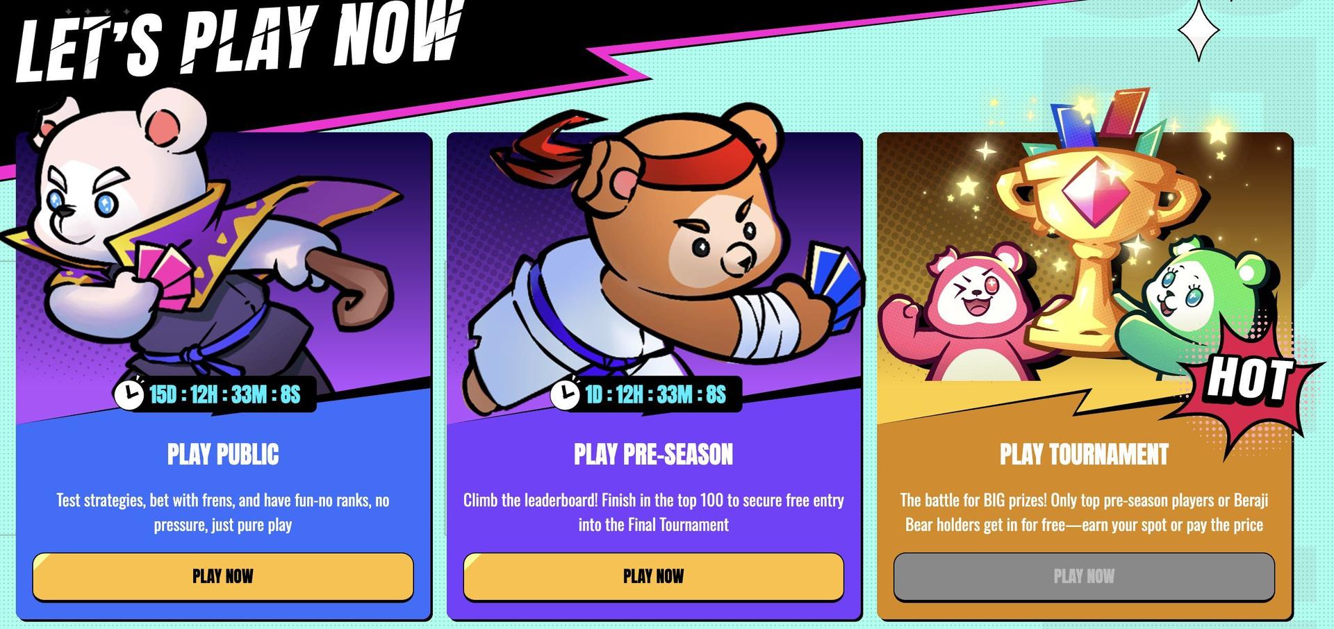 Custom Cards give players who own at least 10 Beraji Bears NFTs the ability to create a personalized battle card with stat control. This system adds a layer of strategic depth for NFT holders, letting them influence how their card performs in combat beyond the default setup.