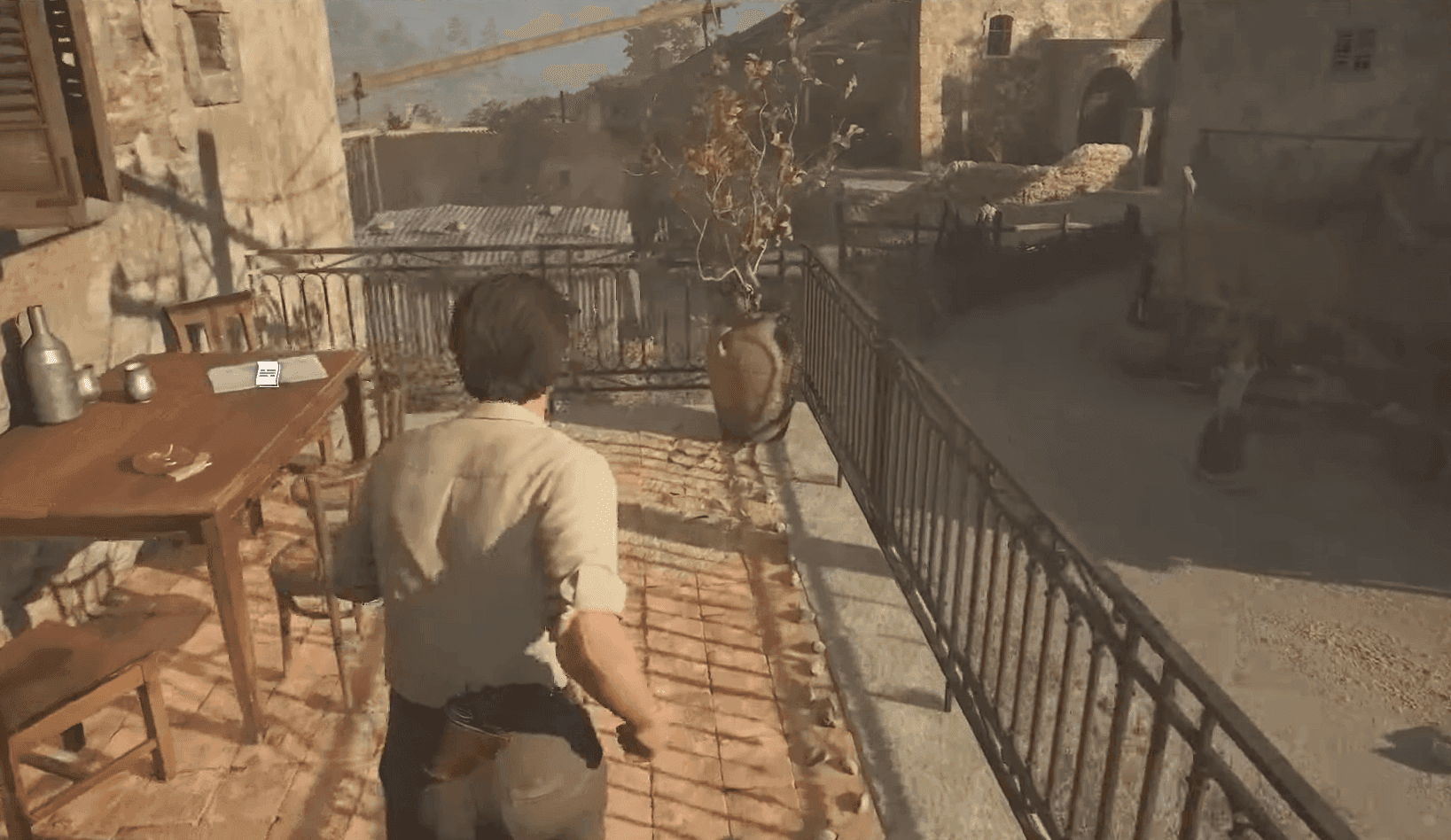 Access the office balcony by climbing the western wall structure. Here you'll find Notes 1 positioned on the outdoor table, offering insights into Lorenzetti's operations.