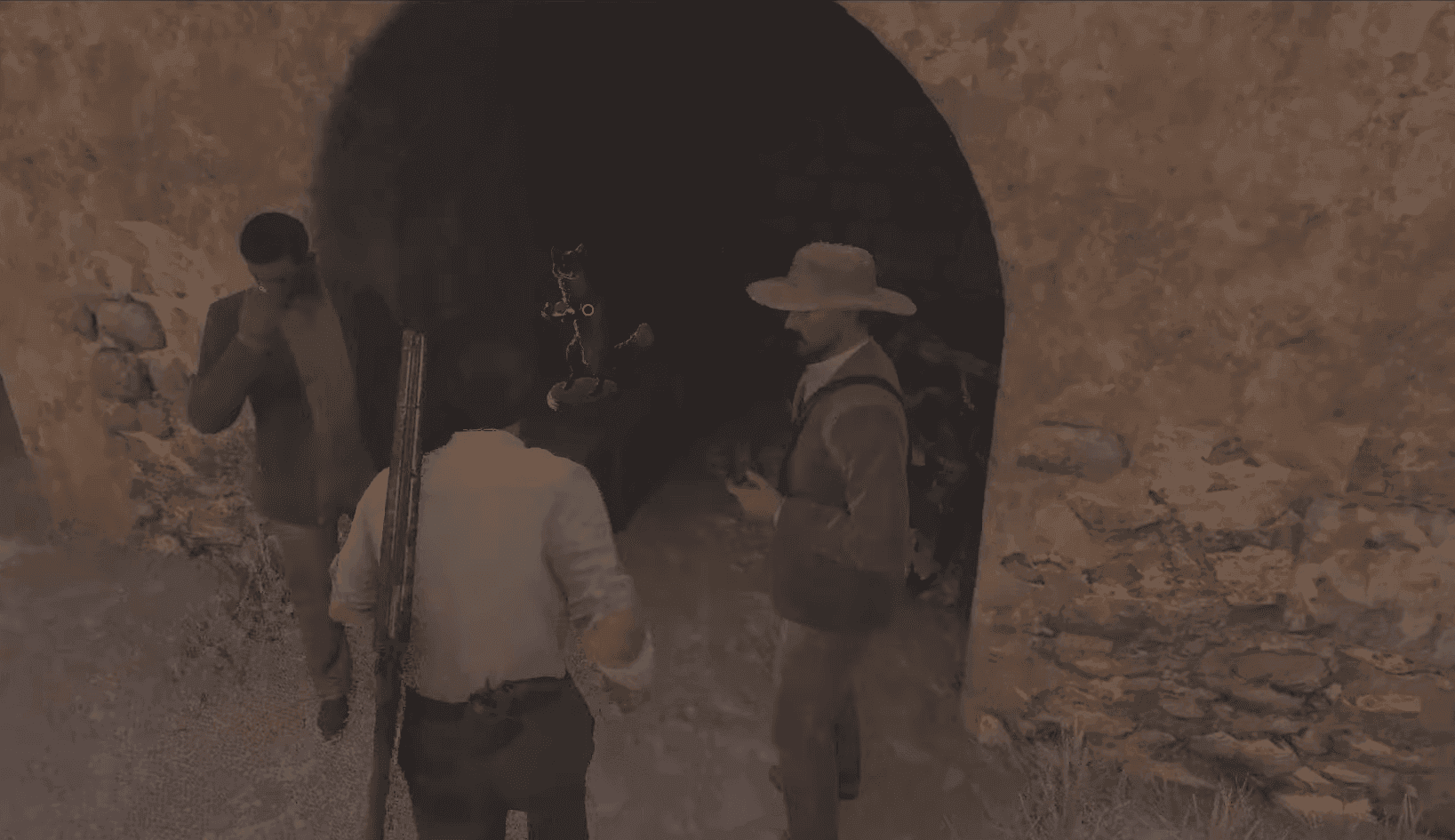 The fox sits in shadow beneath the stone arch, requiring careful observation to spot among the architectural details.