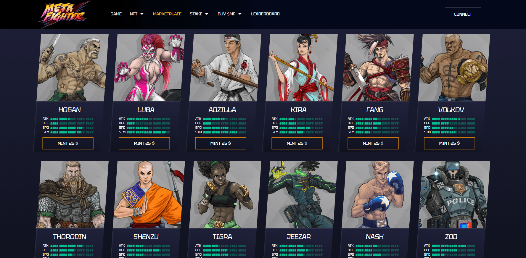 Explore the marketplace to select your first fighter NFT (You can also mint your own NFT). Consider the fighter's attributes and style to match your preferred gameplay. Remember, every new player receives one Fighter NFT for free to kickstart their adventure.