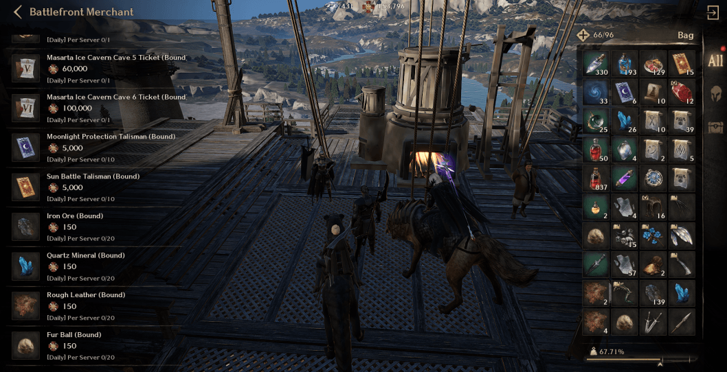The Battlefront Merchant offers core crafting items such as Iron Ore, Quartz Mineral, Furball, etc. These items are crucial for crafting gear, so it is advised that you purchase all of these daily. However, take note that these items are bound (non-tradeable), but you can still use them to craft your first rare gear.