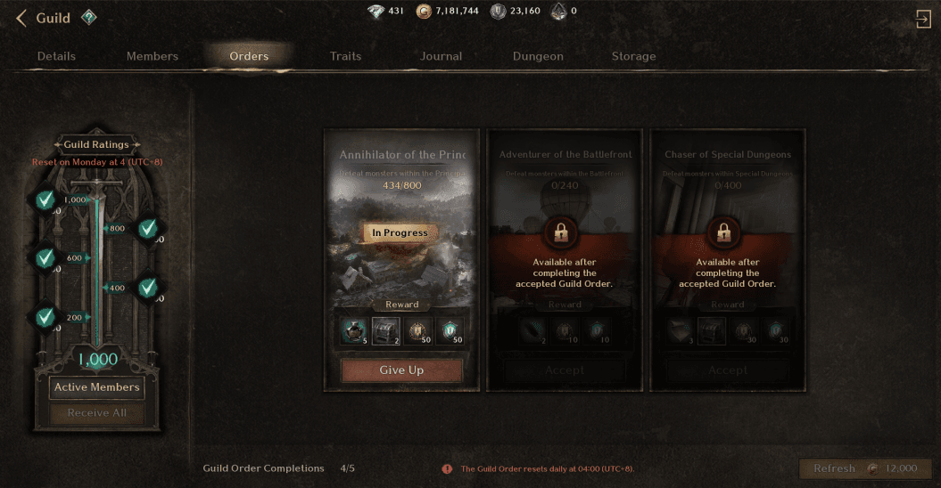 The Guild Orders range from eliminating monsters across various game locations such as anywhere on the World Map, the BattleFront, or within the depths of Special and Regular Dungeons. The required number of monsters to defeat varies, starting from 240 and can go up to 800. For those looking to optimize their efforts, spending gold to reroll guild orders for potentially more rewarding tasks is an option.