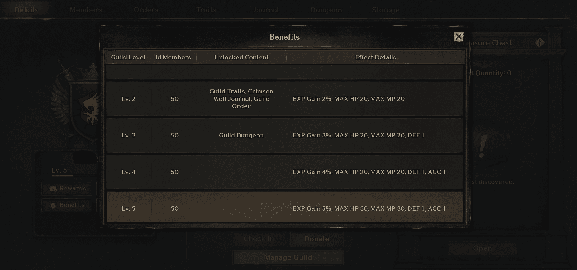 Guild Level Benefits: As your Guild levels up with the help of all its members doing guild orders, it will progressively unlock useful Guild-level benefits such as EXP growth and Combat Stats.