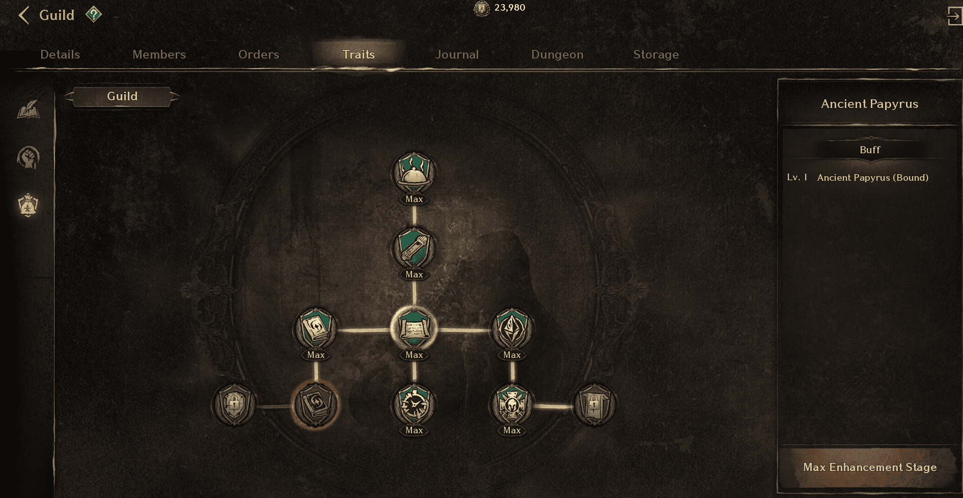 Guild Traits: These are core guild-affiliated buffs and upgrades that members receive for completing Guild orders and progressing the Guild Journal. Once certain Guild levels and Journal progress milestones are reached, the guild owner can select from a variety of buffs and upgrades to be awarded to each guild member. As a free-to-play player, a crucial stat provided by these Traits is combat stats, such as ACCURACY. Another important Guild trait involves unlocking essential materials that will be made available from the Guild merchant, including core crafting materials like Ancient Papyrus, higher Seals of Advancement, and Skill Books.