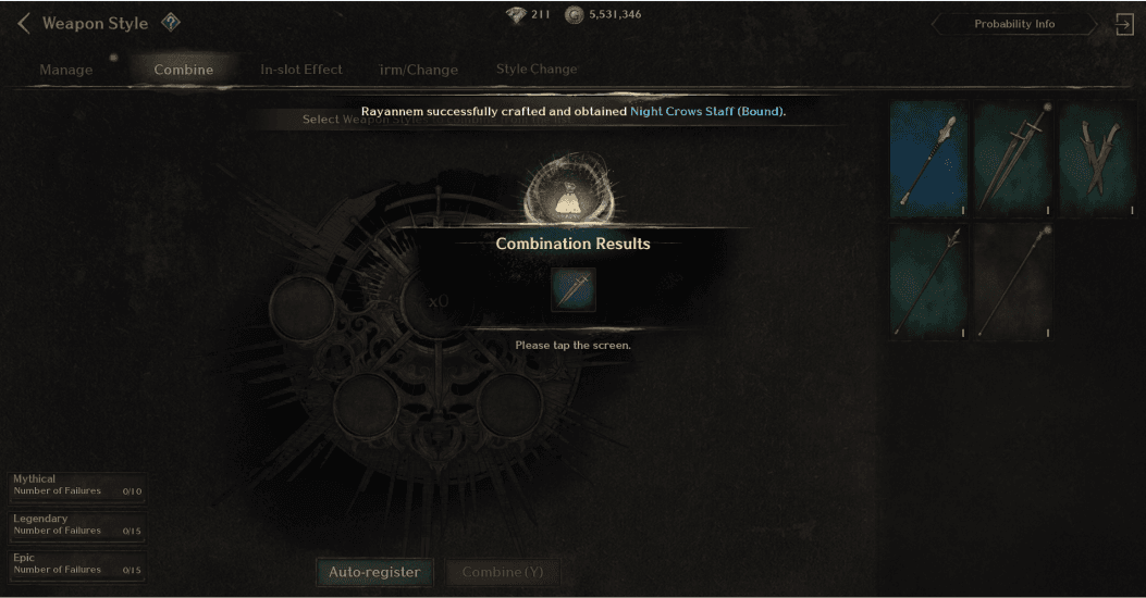 If you have duplicates of mounts and weapon styles, don't hesitate to use the combine feature. This feature uses the extra copies of Mounts and WS to attempt to create a mount or WS of a higher rarity. Note that the success rate for combining into a higher rarity is quite low, but it will only consume the extra copies, so it's worth a try.