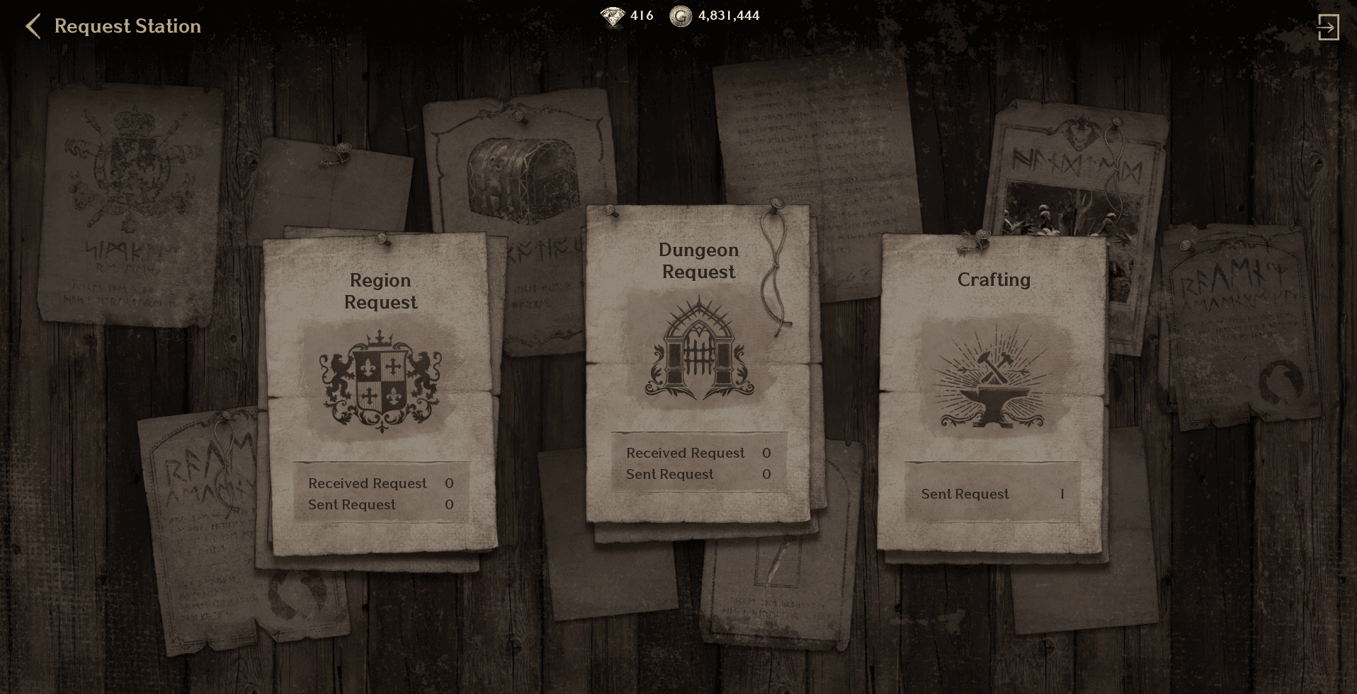 Another source of diamonds is the Request Station. The Request Station is categorized into requests for Region, Dungeon, and Crafting, featuring quests or crafting tasks requested by other characters to earn Diamonds. A tip for securing requests that entail easier tasks, such as lower-level dungeons, is to be on the Request Station bulletin board just before it resets and accept the requests you can complete.