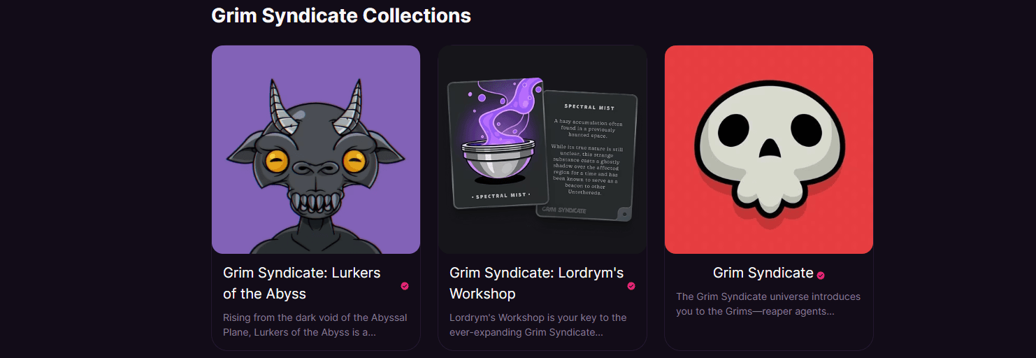 Abysswalkers maakt deel uit van het bredere Grim Syndicate-ecosysteem, dat verschillende NFT's omvat. Deze NFT's vertegenwoordigen unieke, verzamelbare activa binnen het Grim Syndicate-universum. Spelers kunnen deze NFT's verzamelen, verhandelen en gebruiken, die binnenkort toegang en verschillende voordelen kunnen bieden voor het Abysswalkers-spel.