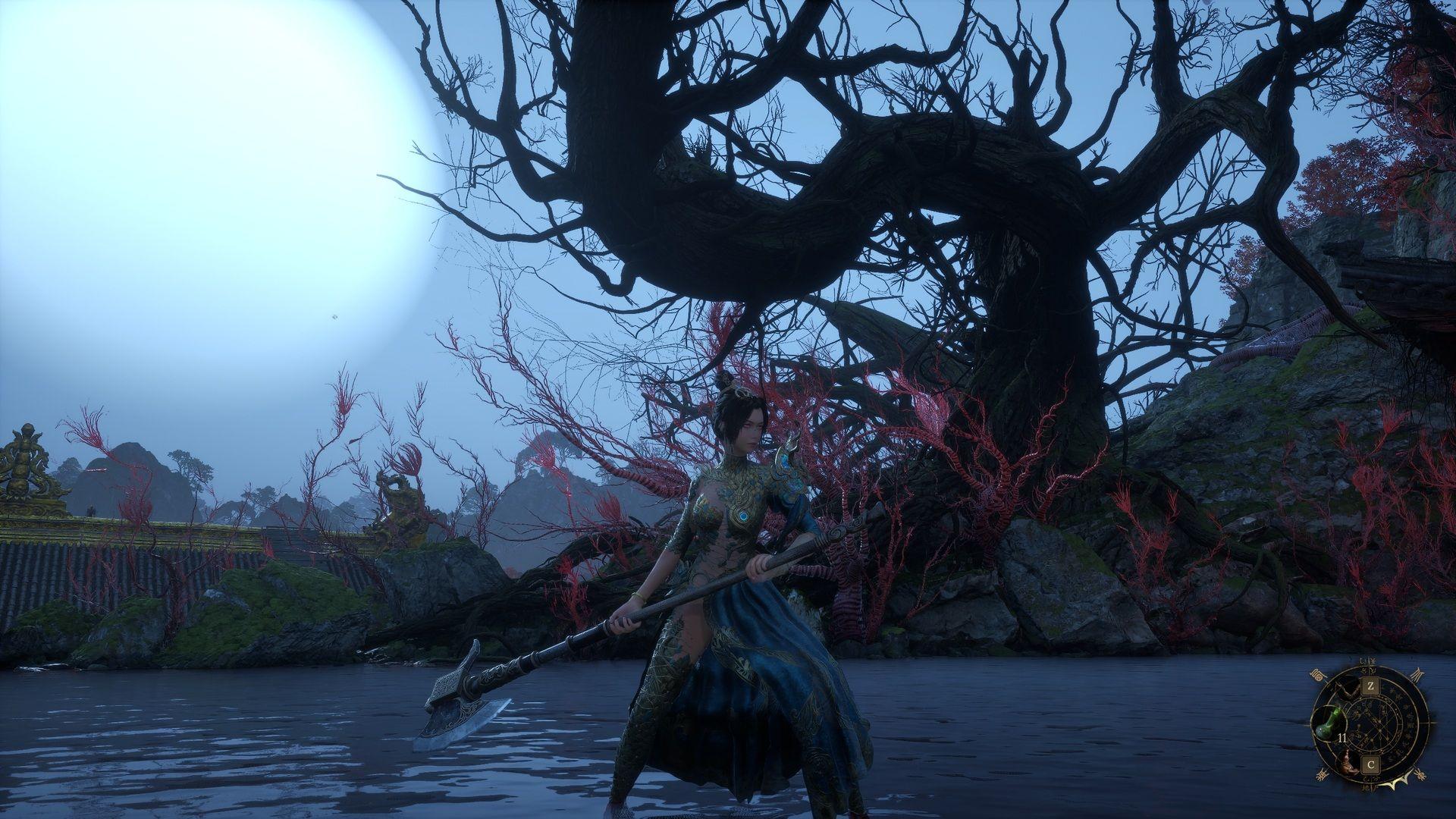 - Strategie: Een baas met twee fasen, te vinden achter Altar Gate. De tijgervorm in fase één gebruikt bliksem- en veegaanvallen. Gebruik de L1-sprong van de Empyrean Greataxe om de afstand te overbruggen wanneer hij lasers afvuurt of AoE-bliksem cast. In fase twee voegt een ruiter zich bij en wordt de magie agressiever. Roep Huang Jian’e op met de Bone Whistle indien beschikbaar om aggro te verdelen. Val altijd aan vanaf de flanken of achterkant voor veiligere vensters.
