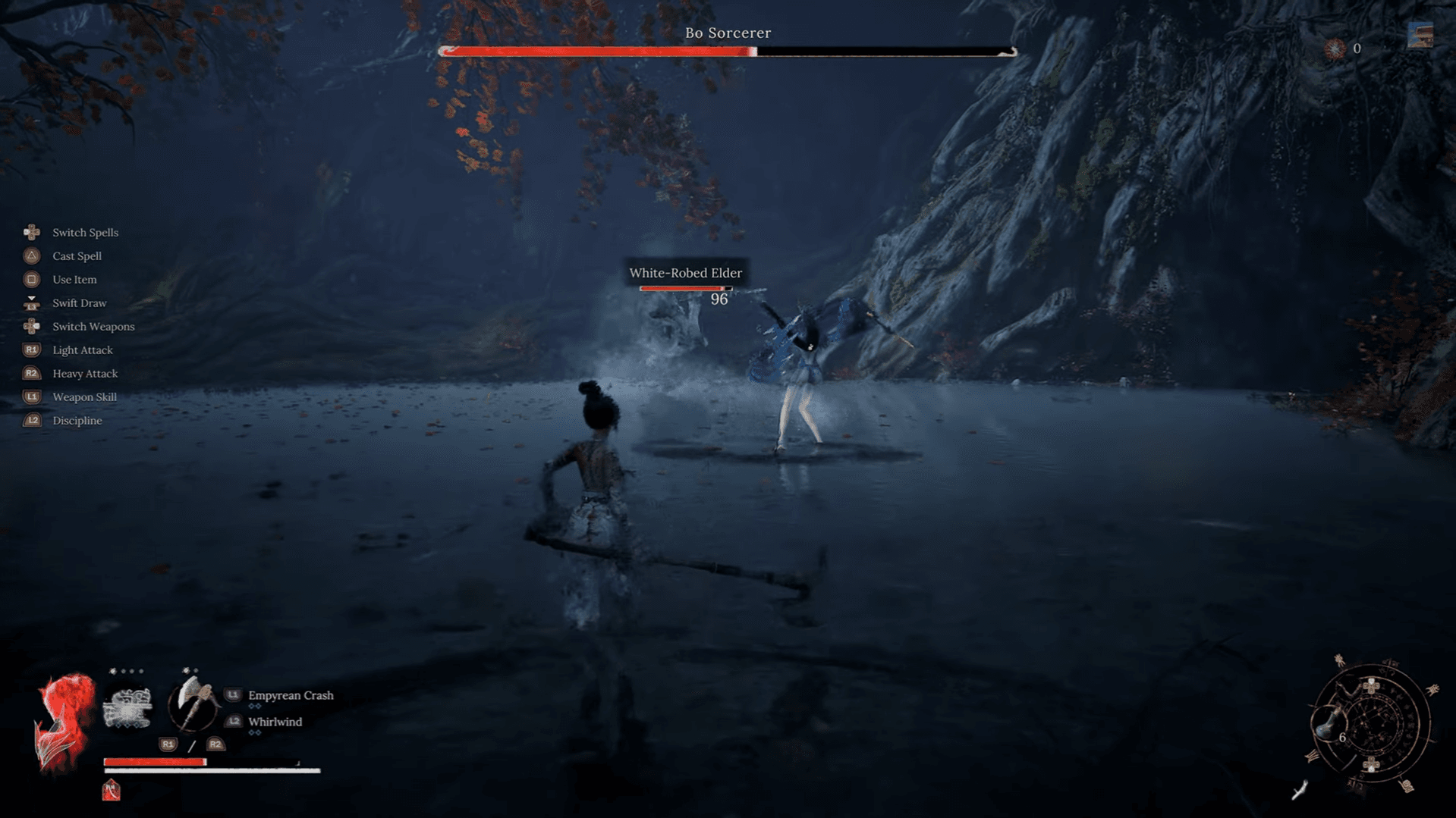 - Strategie: Deze snelle baas, te vinden in het Avian Dwelling-gebied, gebruikt een combinatie van watermagie en speergebaseerde mêlee-aanvallen. Als je de White-Robed Elder hebt geholpen, kun je hem oproepen met de Bone Whistle om aggro te trekken, wat het gevecht veel gemakkelijker maakt. Blijf achter haar tijdens casting-animaties om geladen treffers te landen, of gebruik Echo of Soulwood voor schade op afstand. Solo-spelers moeten het ontwijken beheersen, vooral wanneer ze waterbellen en luchtprojectielen aan elkaar rijgt.