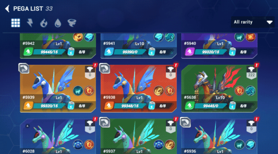 Bloodlines e Raridade do Pega: Existem quatro bloodlines de Pega, cada uma representando um elemento diferente. Por enquanto, temos quatro bloodlines: Hoz, Campona, Klin e Zan. No futuro, novas bloodlines serão desbloqueadas. Cada bloodline é identificada pelo design das asas.