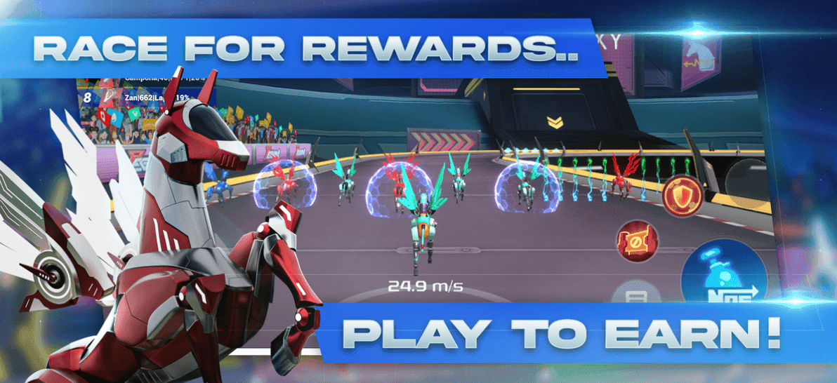 Bem-vindo ao Pegaxy: Blaze, um jogo mobile de corrida de cavalos insano onde você e outros sete corredores disputam o topo do pódio. Use seus elementos, habilidades e manobre seu caminho até a vitória para aumentar seu prestígio. Faça upgrade, monte sua build e domine os leaderboards. Os donos podem ganhar fazendo Trading de NFTs no Marketplace, colecionando e negociando Pega NFTs raros, e competindo em torneios.