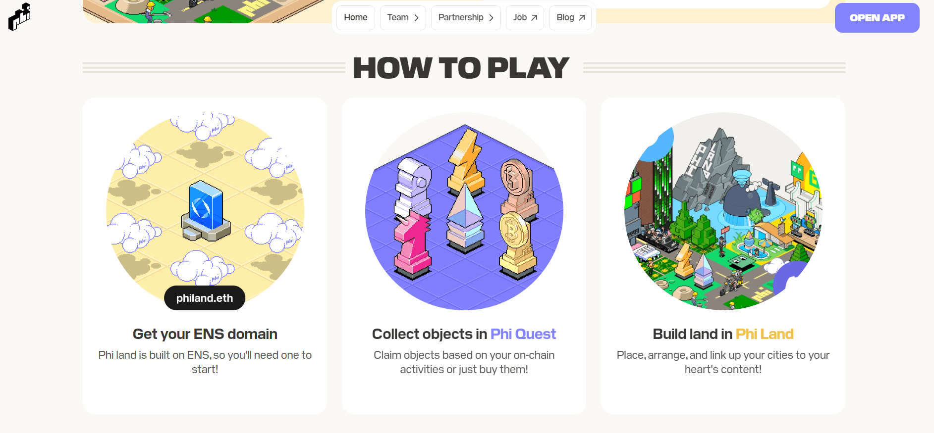 Em PhiLand, a jornada de cada player começa com seu próprio Phi Land, um espaço virtual diretamente ligado ao seu domínio do Ethereum Name Service (ENS). Esse terreno não é apenas um asset estático; é um lugar para expressão e criatividade. Os players podem personalizar seus terrenos com diversos objetos e decorações, refletindo suas atividades on-chain e gostos pessoais.